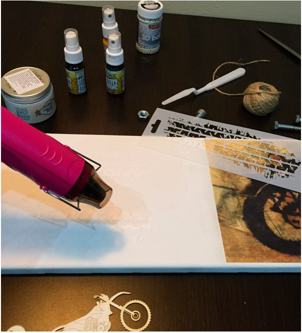 Najskôr som nalepil obrázok motorky Soft Matte Gelom a potom som už pastou nanášal cez šablónu vzor pneumatiky. S pastou a šablónou sa pracovalo výborne. Vrele odporúčam. Pre rýchlejšiu prácu som všetko vysušil teplovzdušnou pištoľou.
