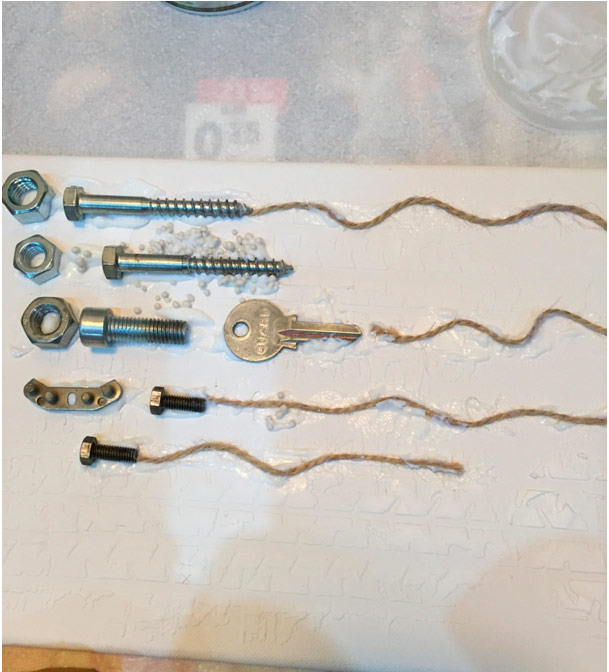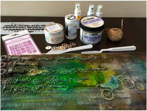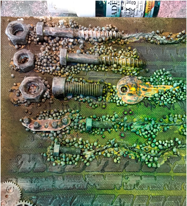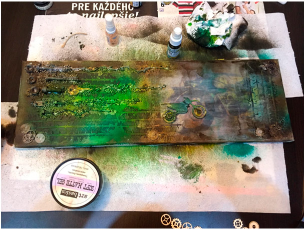 Soft Matte Gelom som prilepil aj "kovový poklad" objavený v garáži. Potom som načrtol priestor prírodným špagátom a postupne priestor doplnil o 3D guličky. Vznikla tak zaujímavá koláž.