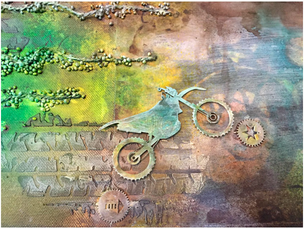 Po celkovom zaschnutí obrazu som ho ešte zapatinoval bielou akrylovou farbou. Tak dostal obraz "ošumtelý" vzhľad. Na ďalších fotkách vidieť zopár detailov kovových prvkov, koliesok, motorky a podobne.